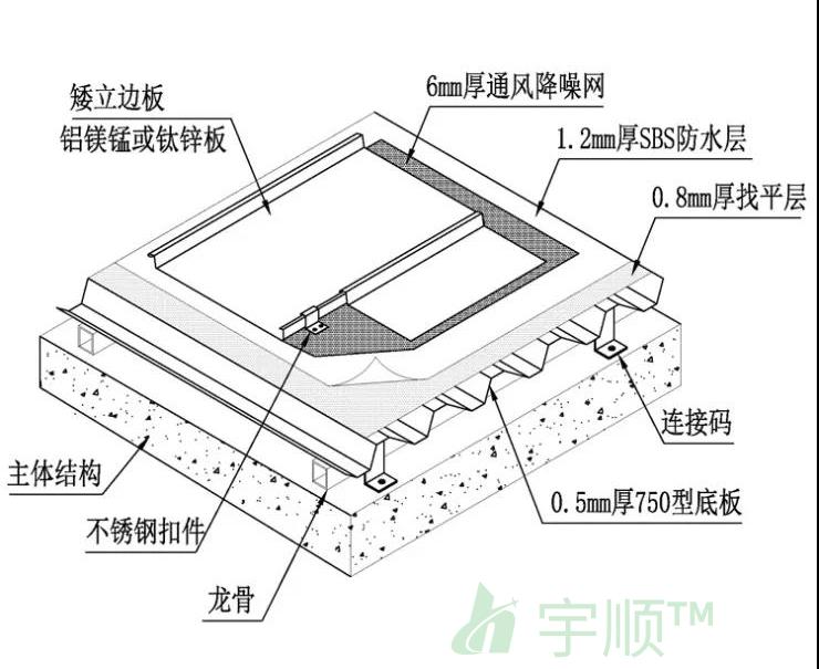 矮立邊鋁鎂錳板是采用立邊咬合構造,咬合的方式與高立邊不同。材料利用方面矮立邊鋁鎂錳系統有著較高的材料利用率最高可以達到82.5%,而高立邊屋面鋁鎂錳系統只有71.6%左右,基層與檁條之間用自攻螺絲固定。另一方面基層與面板之間用不銹鋼或鋁鎂錳板材料做的扣件固定,屋面板塊之間是以特有的咬合折疊方式銜接,上下兩塊板搭載重合后,以270°單咬合或360°雙咬合,所以矮立邊屋面施工難度更大一點,但是構成一個密封的整體,屋面會有很好的防水防滲性能。
